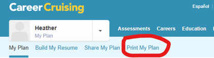 Please take this time to assist your patrons in printing out their "My Plan" from Career Cruising. My Plan can be printed after a patron logs in to their My Plan account. They can select which portions they wish to print and have a hard copy for themselves.