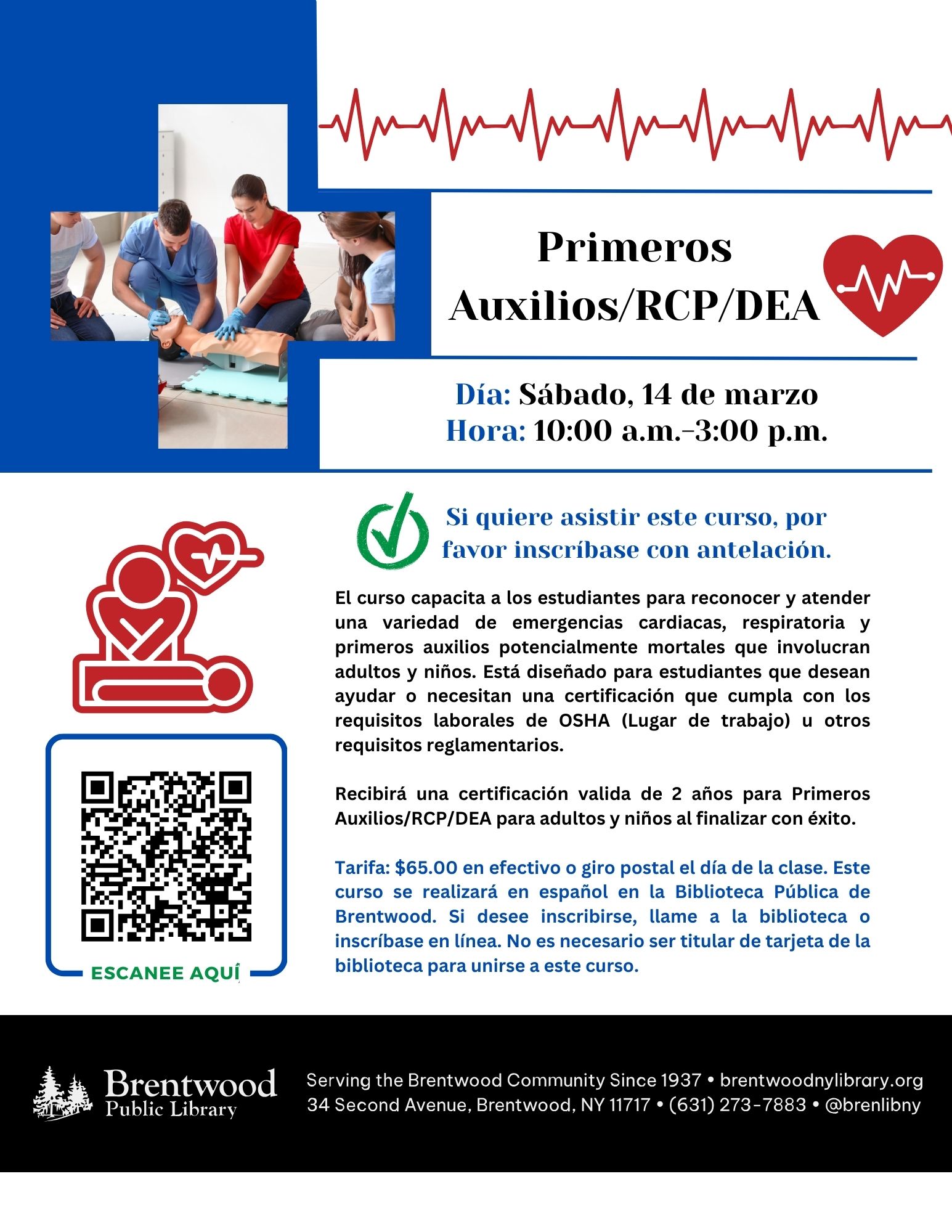 The Brentwood Public Library is offering CPR Training in Spanish this Saturday, March 14th, 10am-3pm. Please share with your patrons as it is open to everyone.